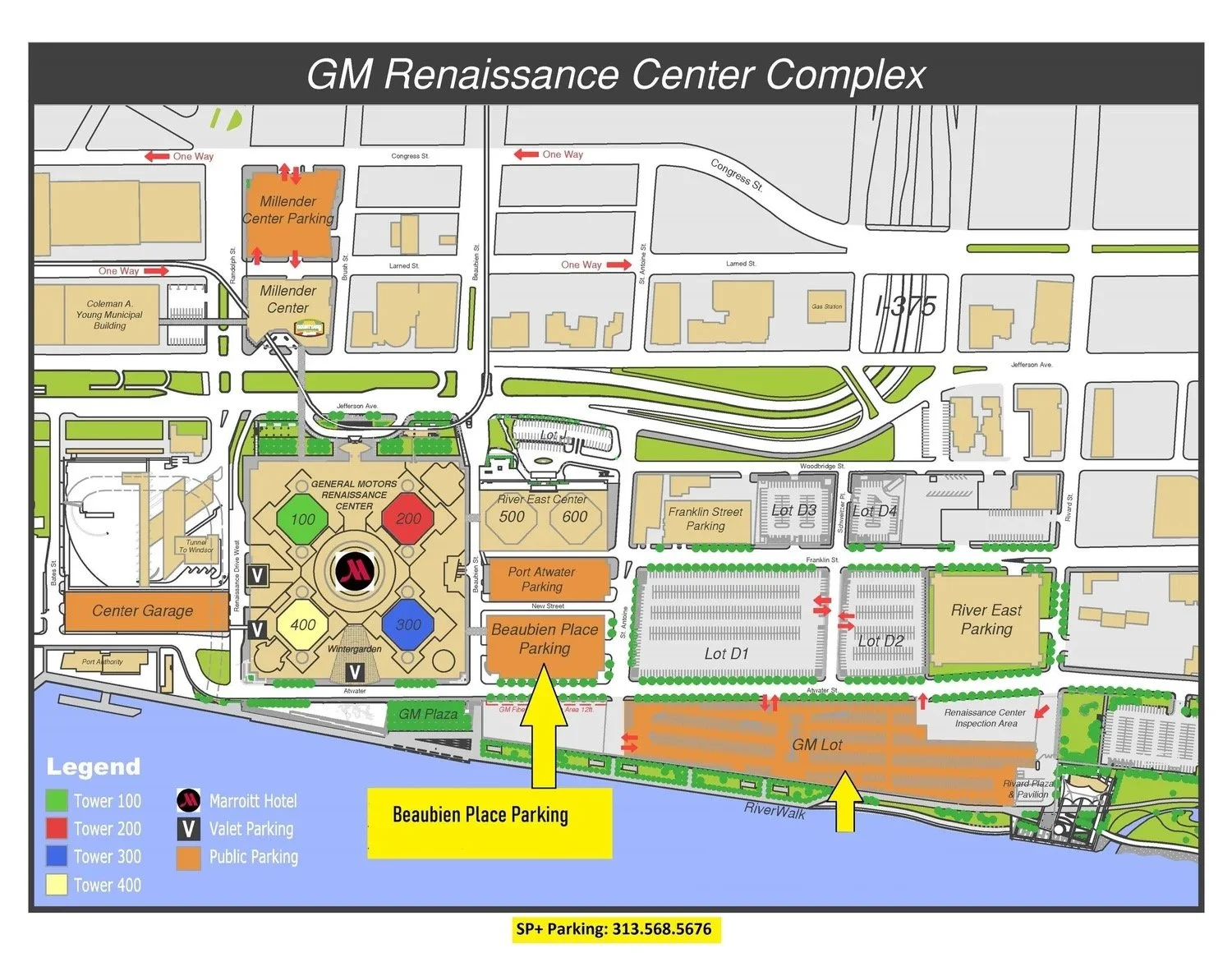 Please utilize the Beaubien Place Parking Garage that is located on the east side of the Rencen, 2nd garage closest to the river. Please make sure you park in this parking structure.